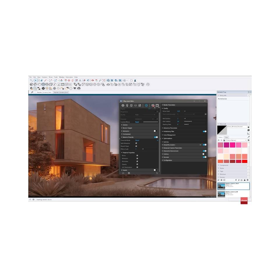 V-Ray beschikt over functies zoals 3D Gaussian Splatting voor efficiënt renderen van gescande objecten, Scatter Edge Trimming voor nauwkeurige plaatsing van objecten op oppervlakken, en Automatic Denoising voor het automatisch verwijderen van ruis uit renders. De Chaos ArchViz Student Collection is ontwikkeld voor wie zich richt op architectonische visualisatie, animatie en fotorealistische weergave binnen onderwijsprojecten.